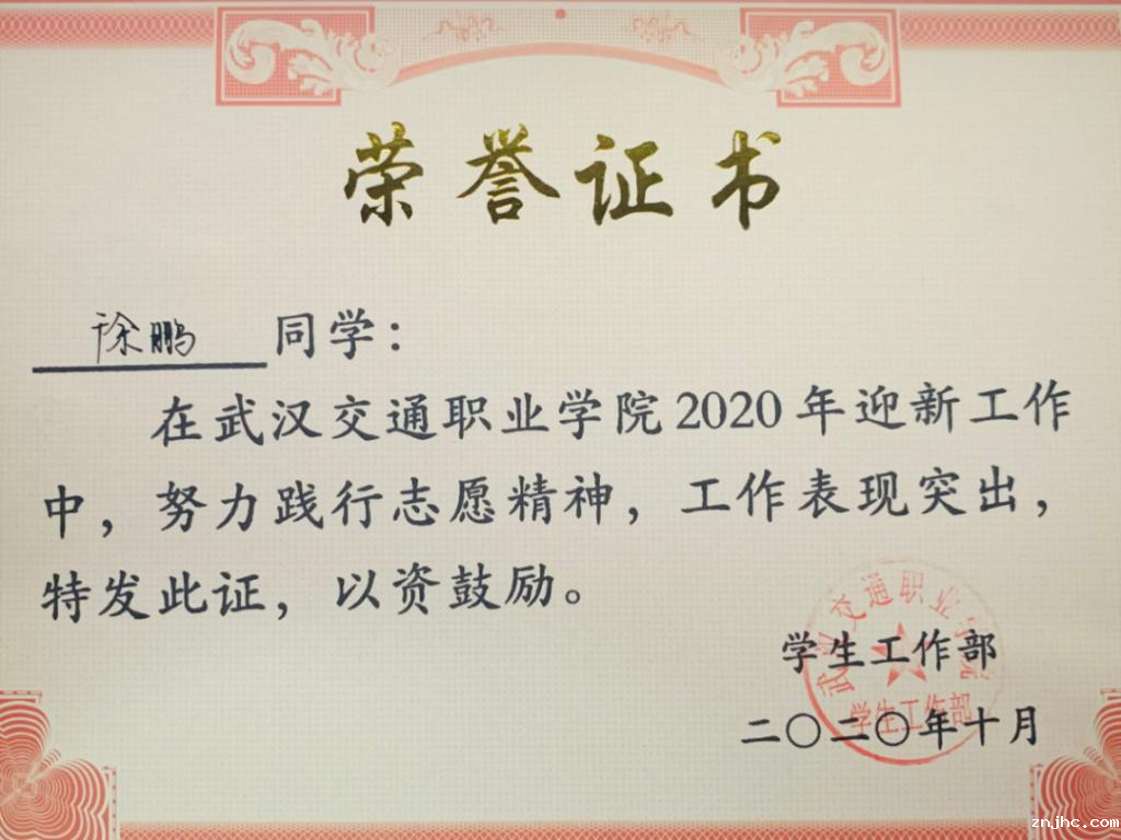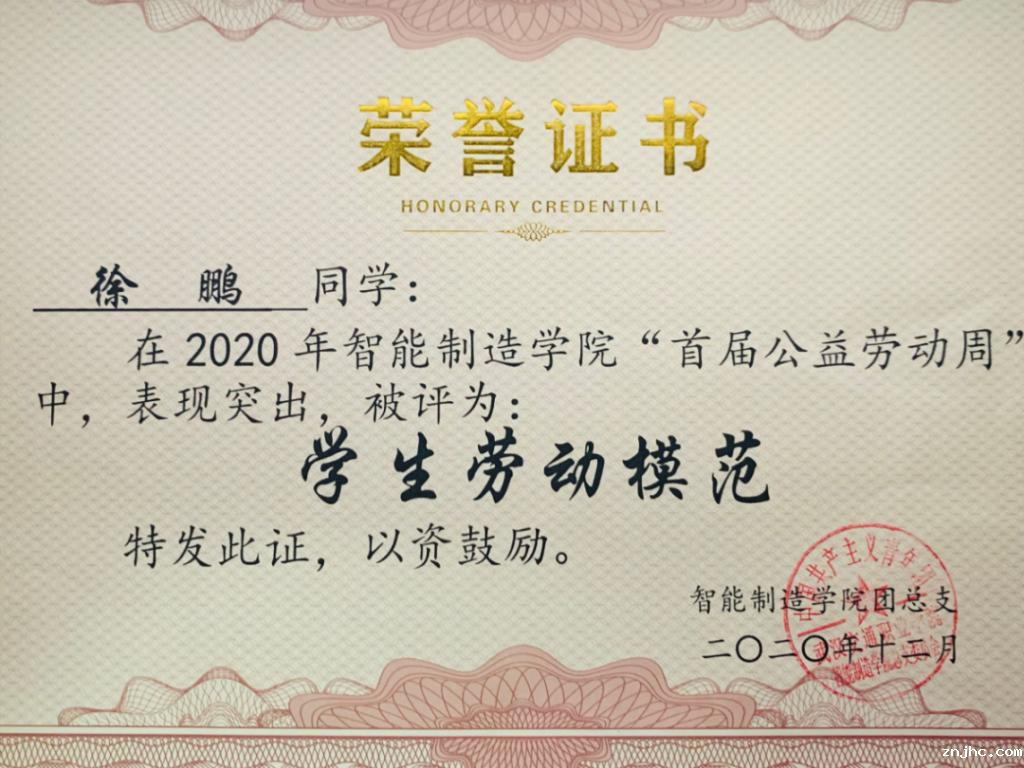 徐鹏不仅在学习上刻苦努力进取,他在工作上更是认真负责,兢兢业业。他在班上担任班长这个职务,时刻关注班级同学的学习和生活情况。在学习上积极进取、在生活中积极向上,作为班长他认为只有以身作则,才能起到良好的带头作用。“俯首甘为孺子牛”,在班上徐鹏将全心全意为同学服务作为宗旨,同学有困难需要帮助,他总是随叫随到的那一个,他努力照顾着这个大家庭。同时他也时常反思自己,能够处理好班内各项事务,努力履行好班长的职责。“在其位谋其政,任其职尽其责”,徐鹏时刻严格要求自己,怀着满腔热情全身心投入在班级工作中。