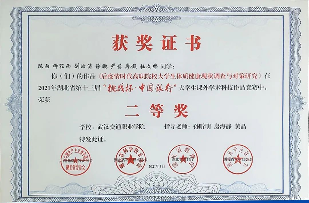 ◆ 2021年“挑战杯·中国银行”湖北省第十三届大学生课外学术科技作品竞赛二等奖