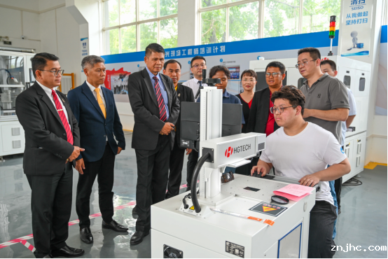代表团一行参观了优米直播app体育实训基地,观摩了华工激光现场工程学院、卫星生产与装配实训室、无人机应用技术产教融合实践中心等教学场景,王文韬主任、张秩凡博士和刘硕老师带领学生团队展示了精湛的激光加工技艺和娴熟的无人机装调与操控能力,泰方代表对学校的实践教学水平给予高度评价。